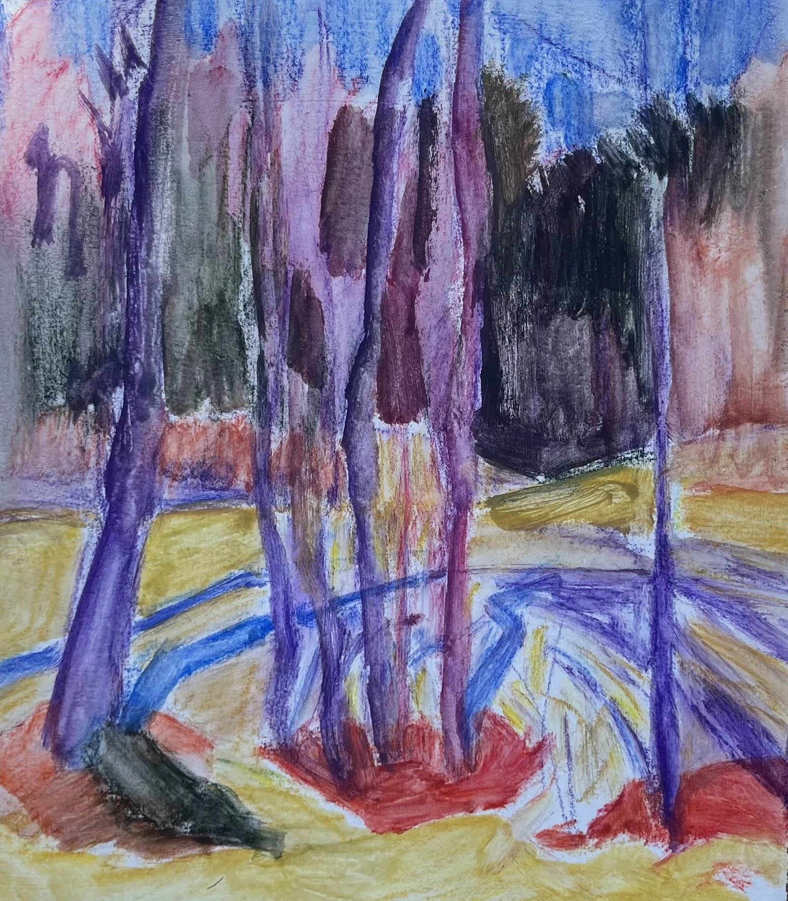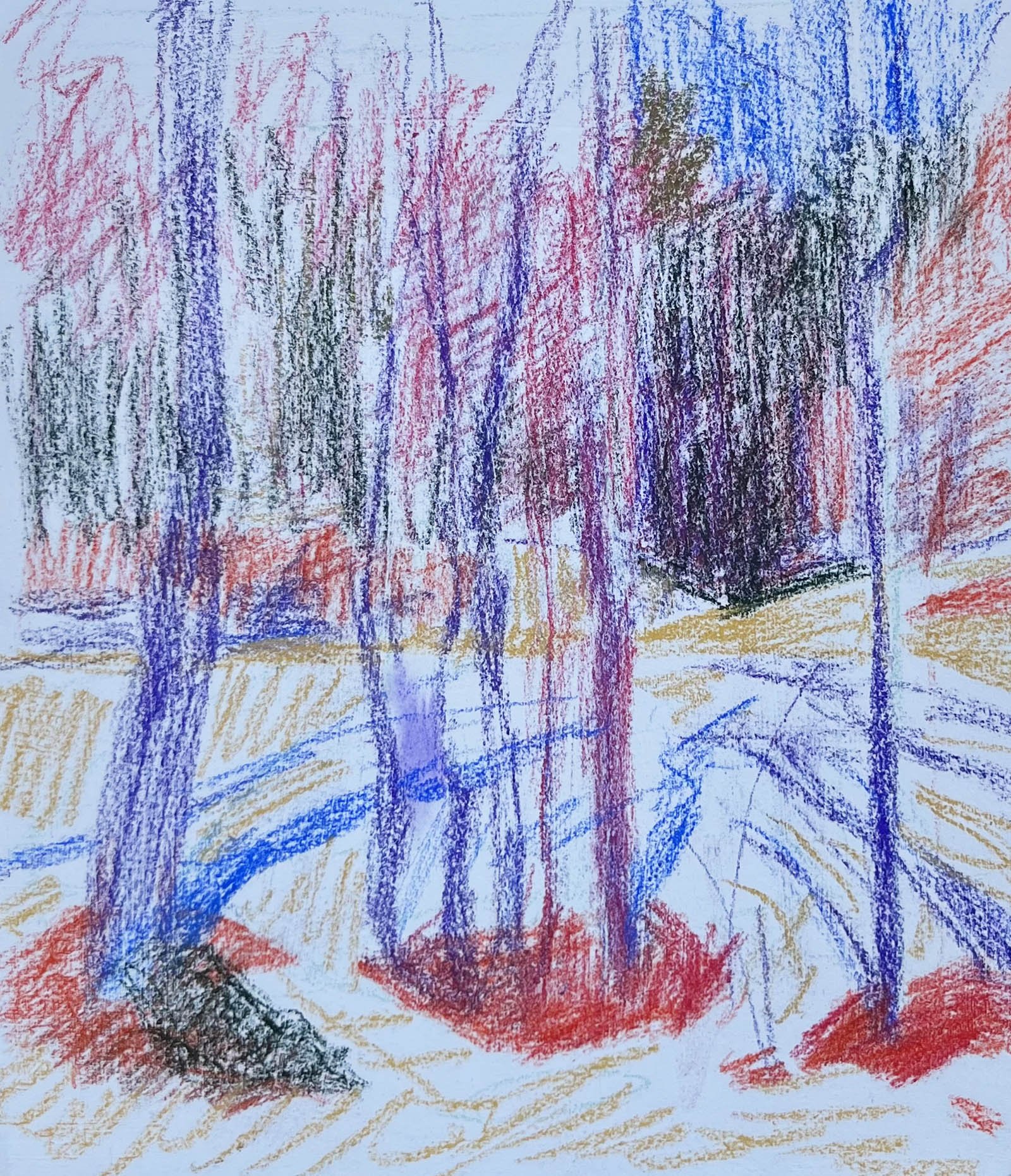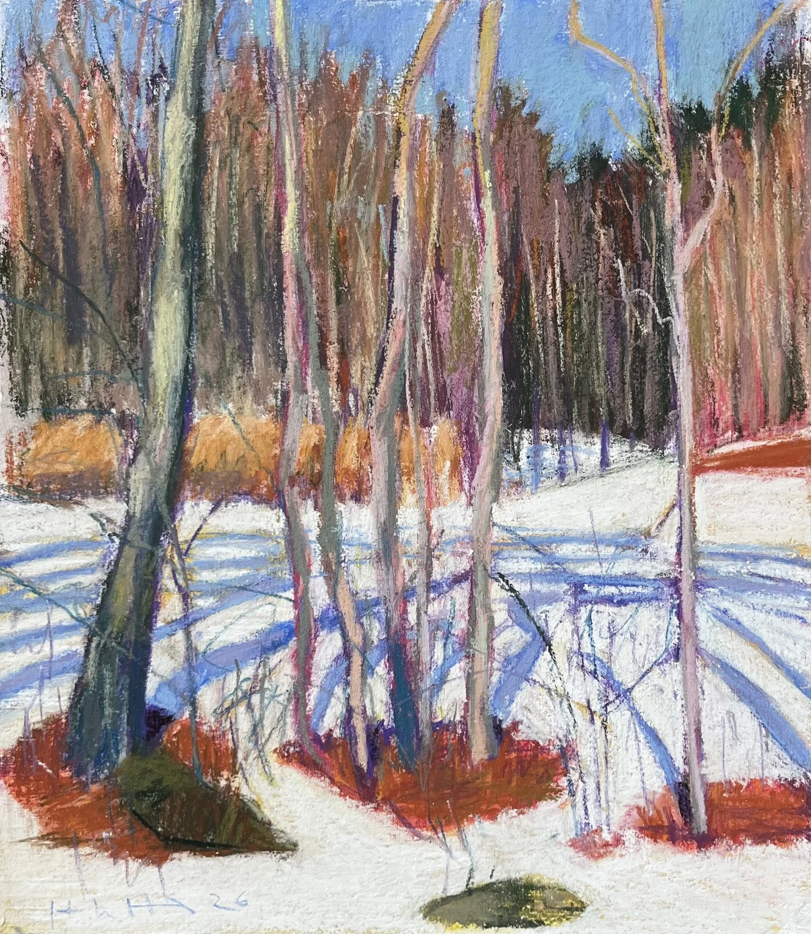 Okay, step one: establish an underpainting. Using hard pastels (I use Nupastels) I worked as quickly as possible knowing light conditions and shadows would be changing rapidly. Established my composition and some colors—I made the snow yellow because it was a warm white with the sunshine on it. I knew I’d be going back over that with layers of white and wanted the yellow to shine through.
